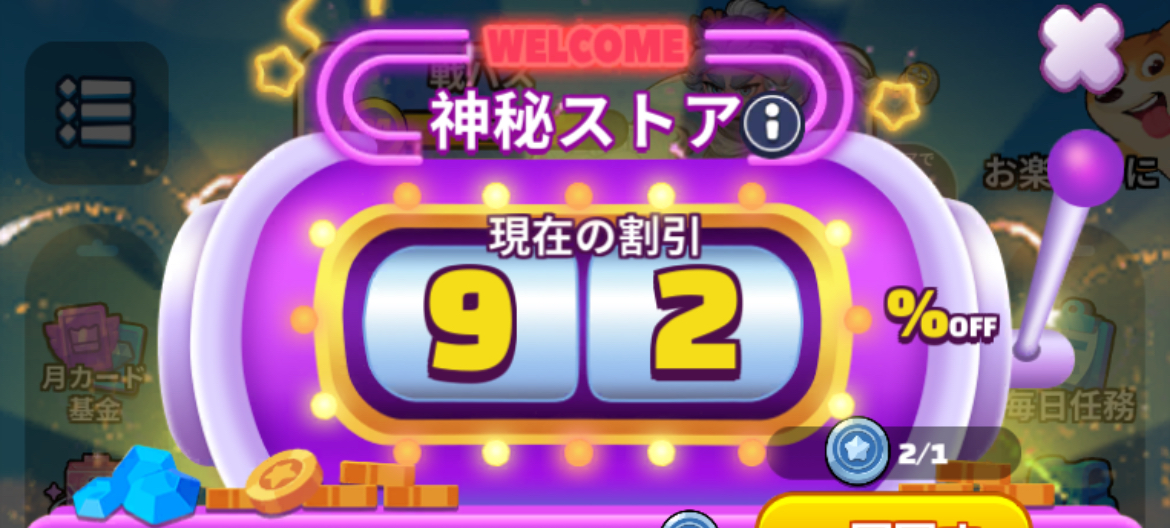 - スロットでランダム設定される割引率でアイテムを購入できる特別ストア